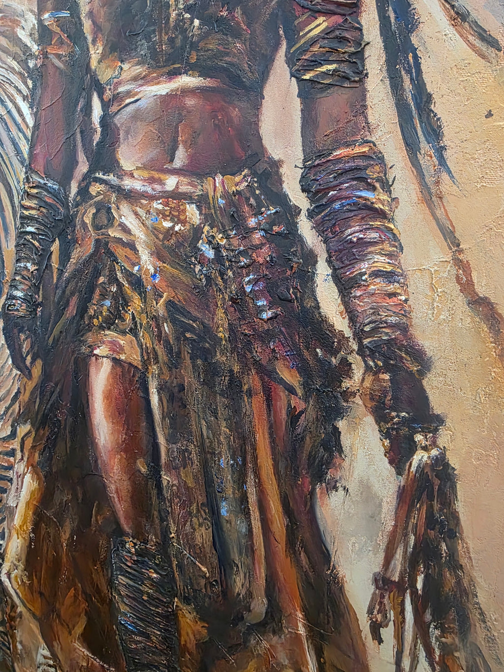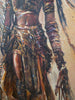 Known for her wisdom and justice, Queen Nekoto ruled with the quiet authority of the Uukwambi matrilineal system, where women held both political and spiritual power. The textured layers of paint and fabric, combined with earthy sienna and bronze tones, evoke the Namibian landscape while celebrating the enduring strength of African queens.