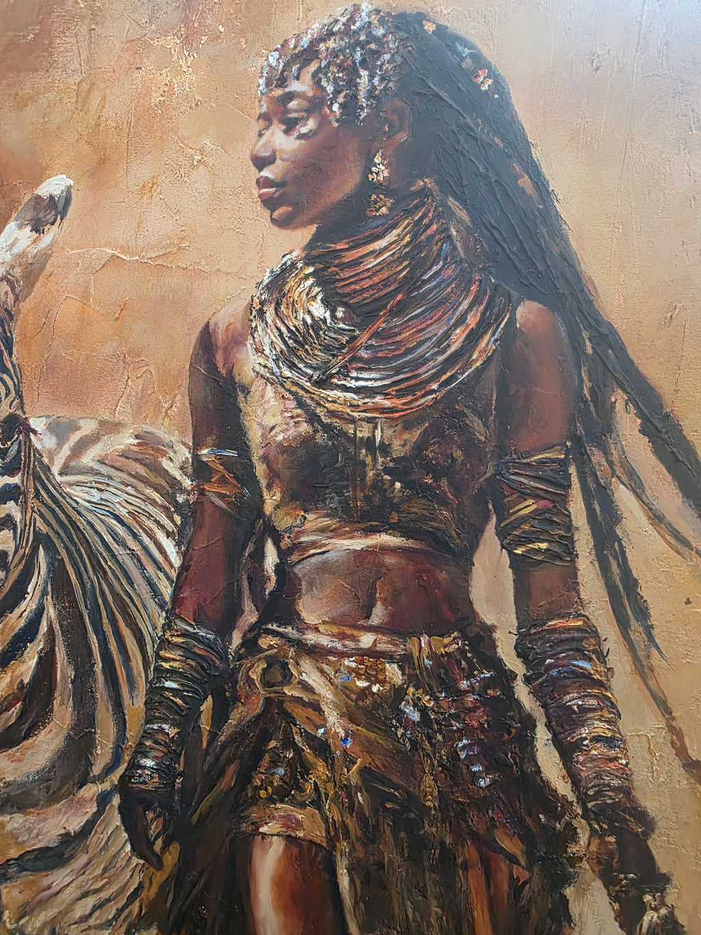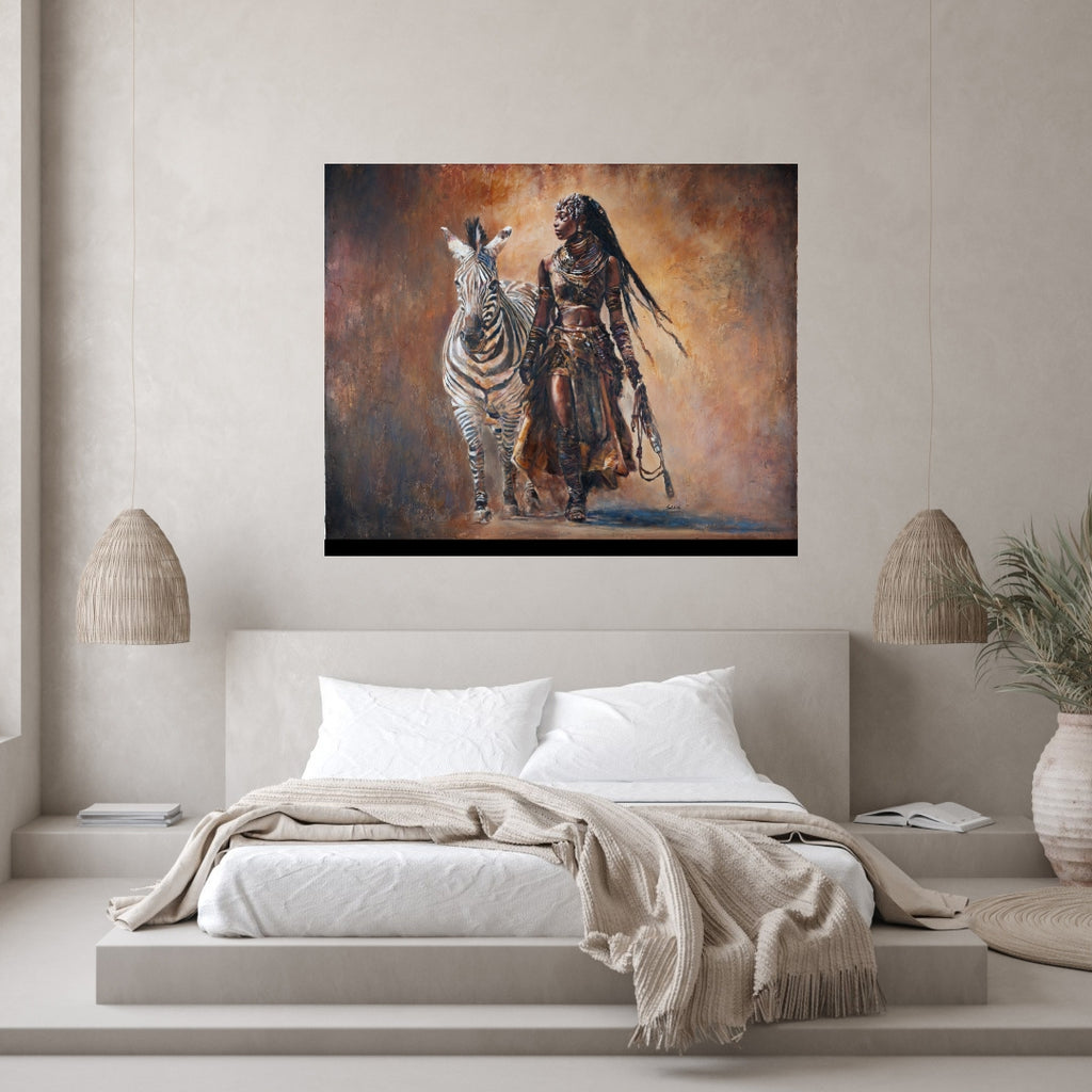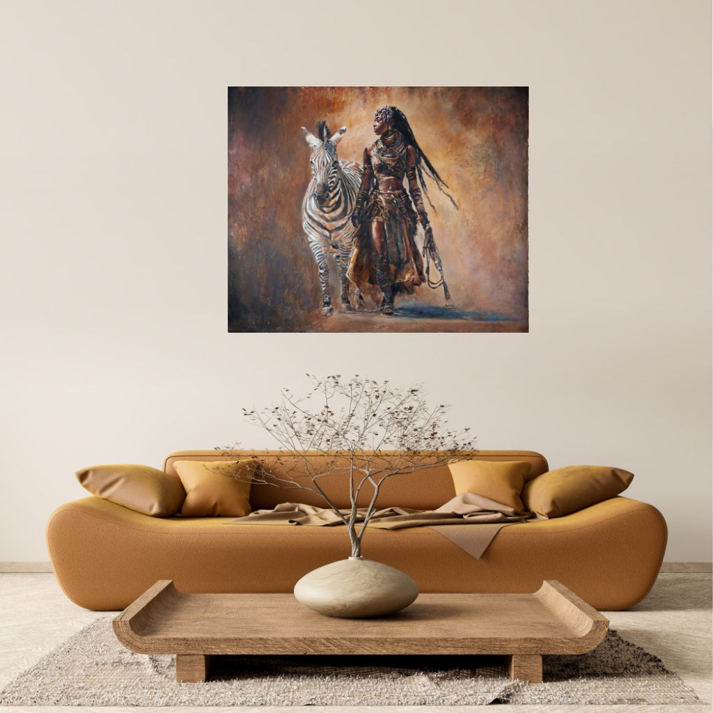 Step into the legacy of Queen Nekoto of the Uukwambi Kingdom through this stunning textured art by African artist Jedidah. This powerful mixed media portrait reimagines the pre-colonial Namibian leader as both warrior and guardian, striding alongside a zebra — her symbol of courage, unity, and balance.