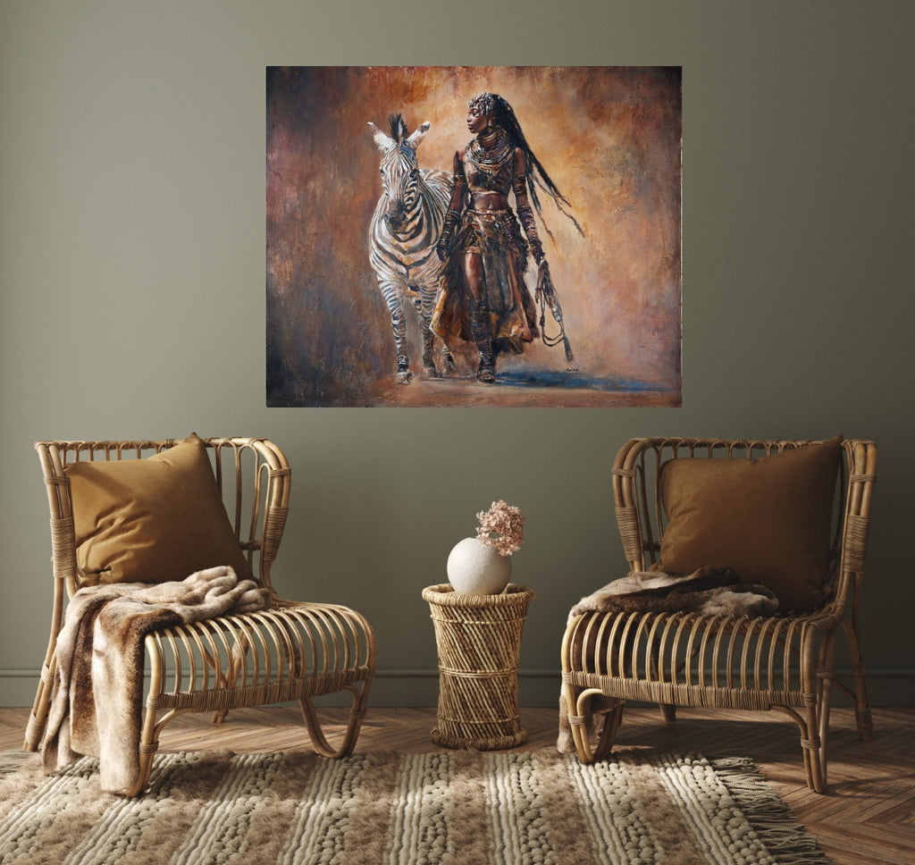 These African artworks bring regal energy and deep storytelling into contemporary spaces — a timeless symbol of feminine leadership, cultural continuity, and the harmony between humanity and nature.