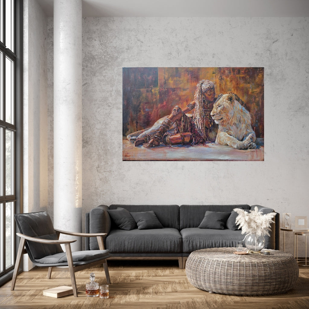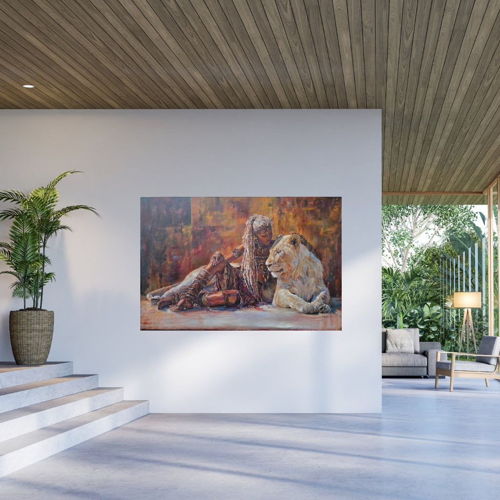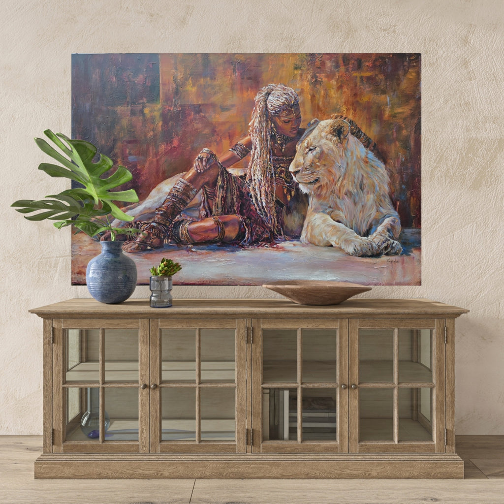 Inspired by Queen Zaria (Zegga), a 14th-century foundational matriarch of the Zazzau Kingdom, this original lion face painting explores quiet authority and rooted power. Seated beside a white lion, the queen embodies strength at rest — calm, sovereign, and deeply self-possessed. A powerful African artwork honouring feminine leadership, ancestry, and presence.