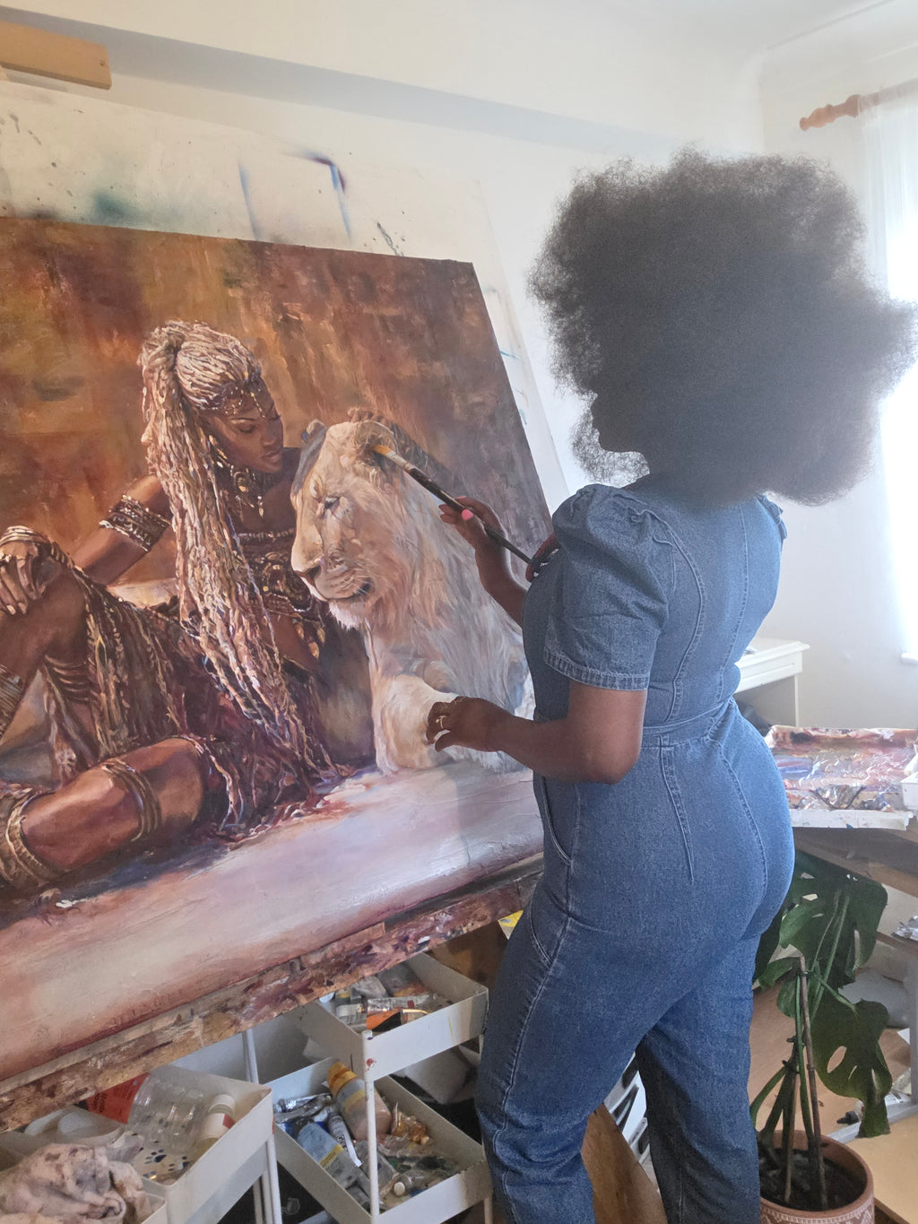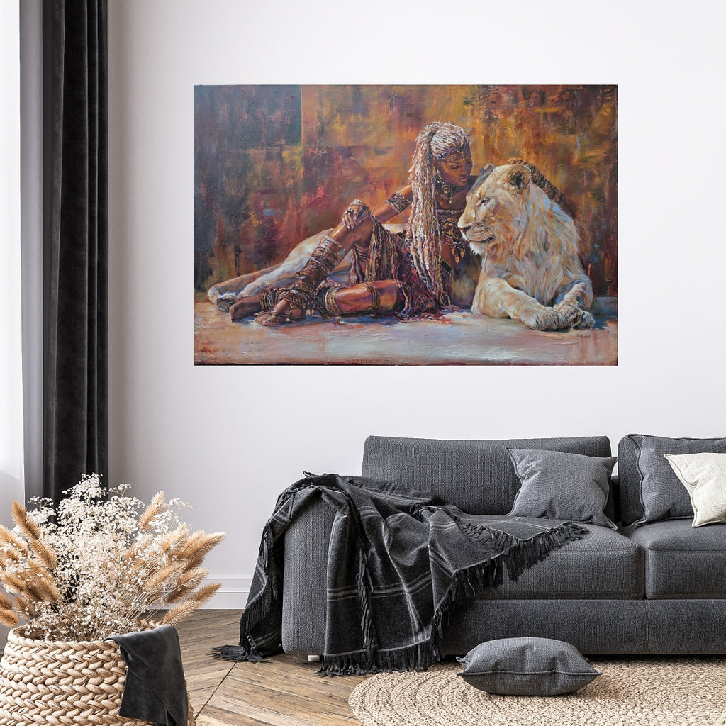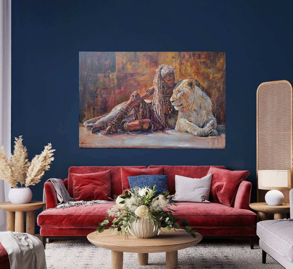 Inspired by Queen Zaria (Zegga), a 14th-century foundational matriarch of the Zazzau Kingdom, this original lion face painting explores quiet authority and rooted power. Seated beside a white lion, the queen embodies strength at rest — calm, sovereign, and deeply self-possessed. A powerful African artwork honouring feminine leadership, ancestry, and presence.