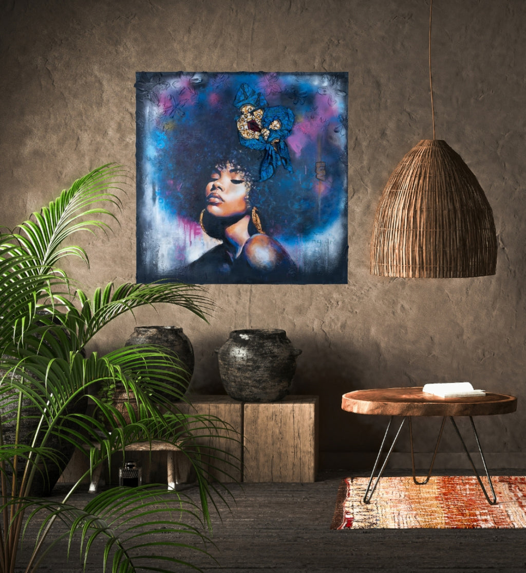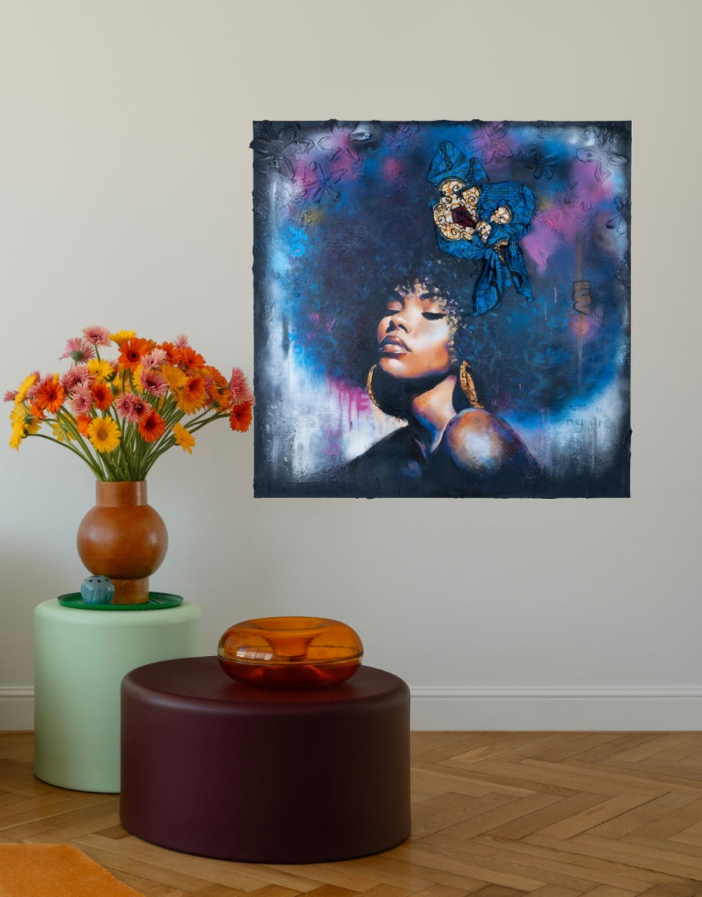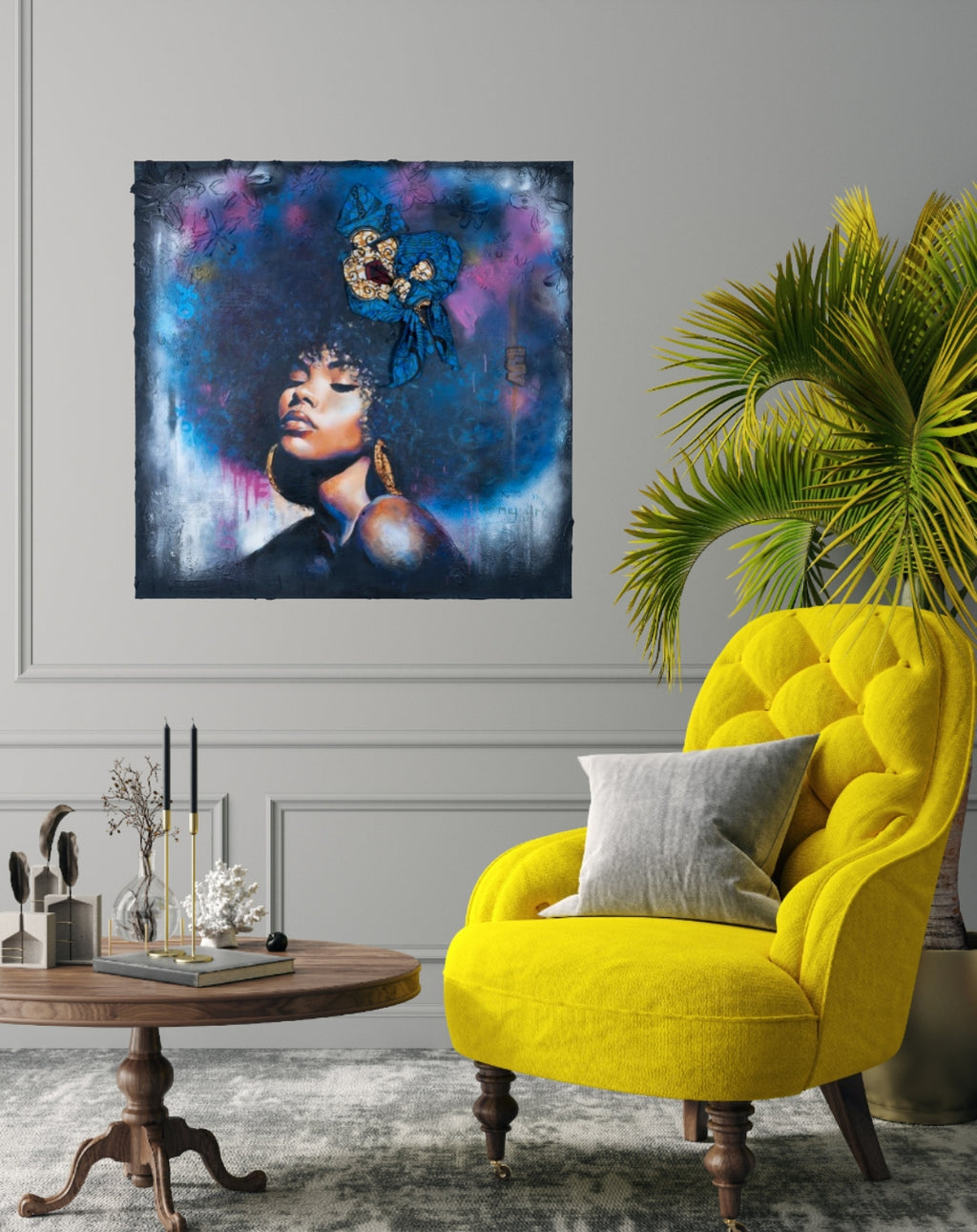 This painting is a love letter to Jedidah's younger self — and to anyone who’s ever felt unseen. The woman in "Rudo" sits in strength and softness. Her afro, hand-detailed with expressive brushwork, becomes a crown — brought to life with rich textures and real African fabric sewn into the canvas. "Rudo" is bold, unapologetic, and deeply rooted.