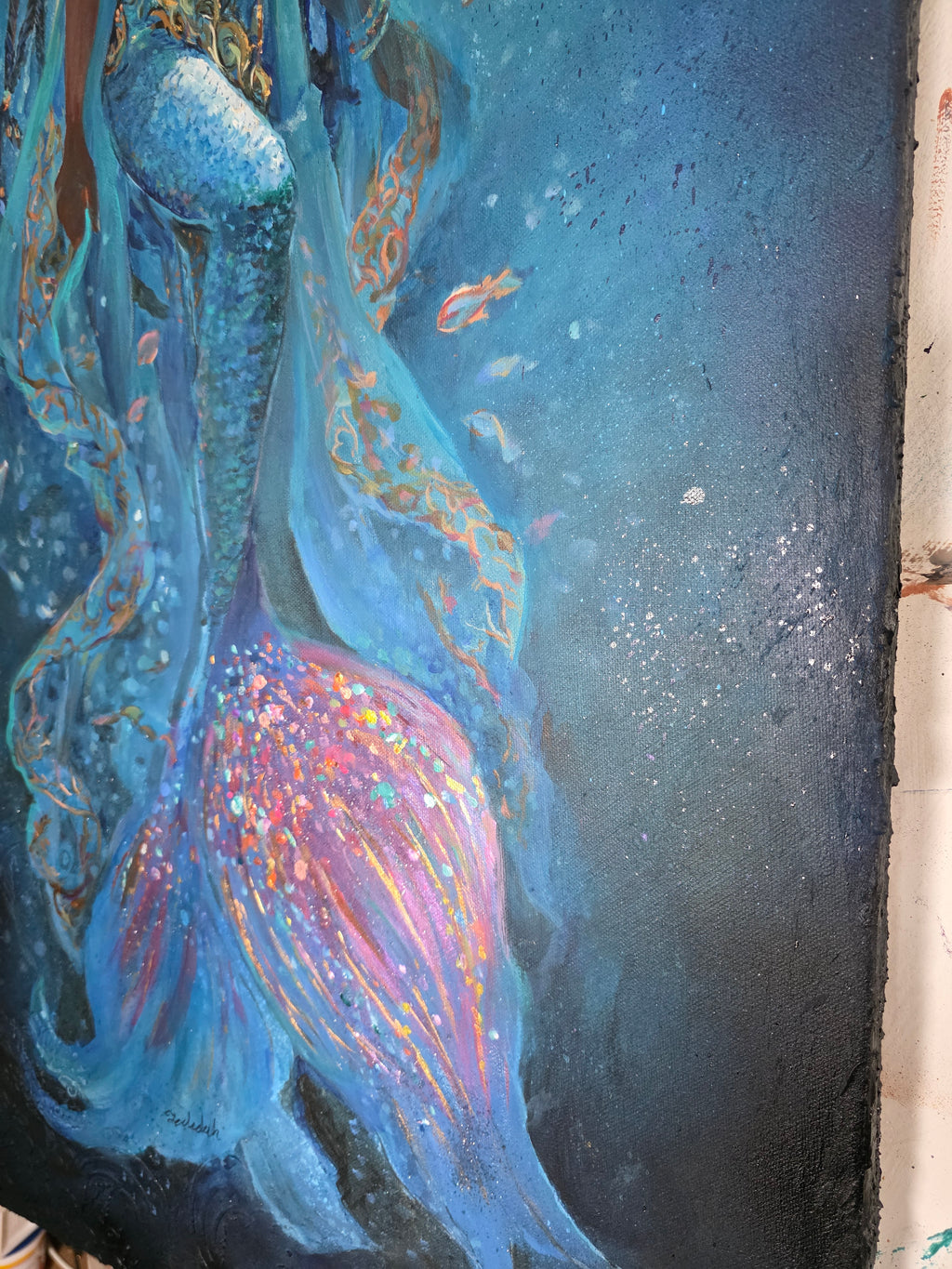 This radiant mermaid art painting is inspired by Mwana Kupona (c. 1810–1865) of Pate Island, a historically verified Swahili poet and noblewoman whose 1858 didactic poem Utendi wa Mwana Kupona remains one of East Africa’s most important works of female-authored literature. Though not a reigning monarch, she was a respected voice of moral, spiritual, and cultural guidance within coastal society.