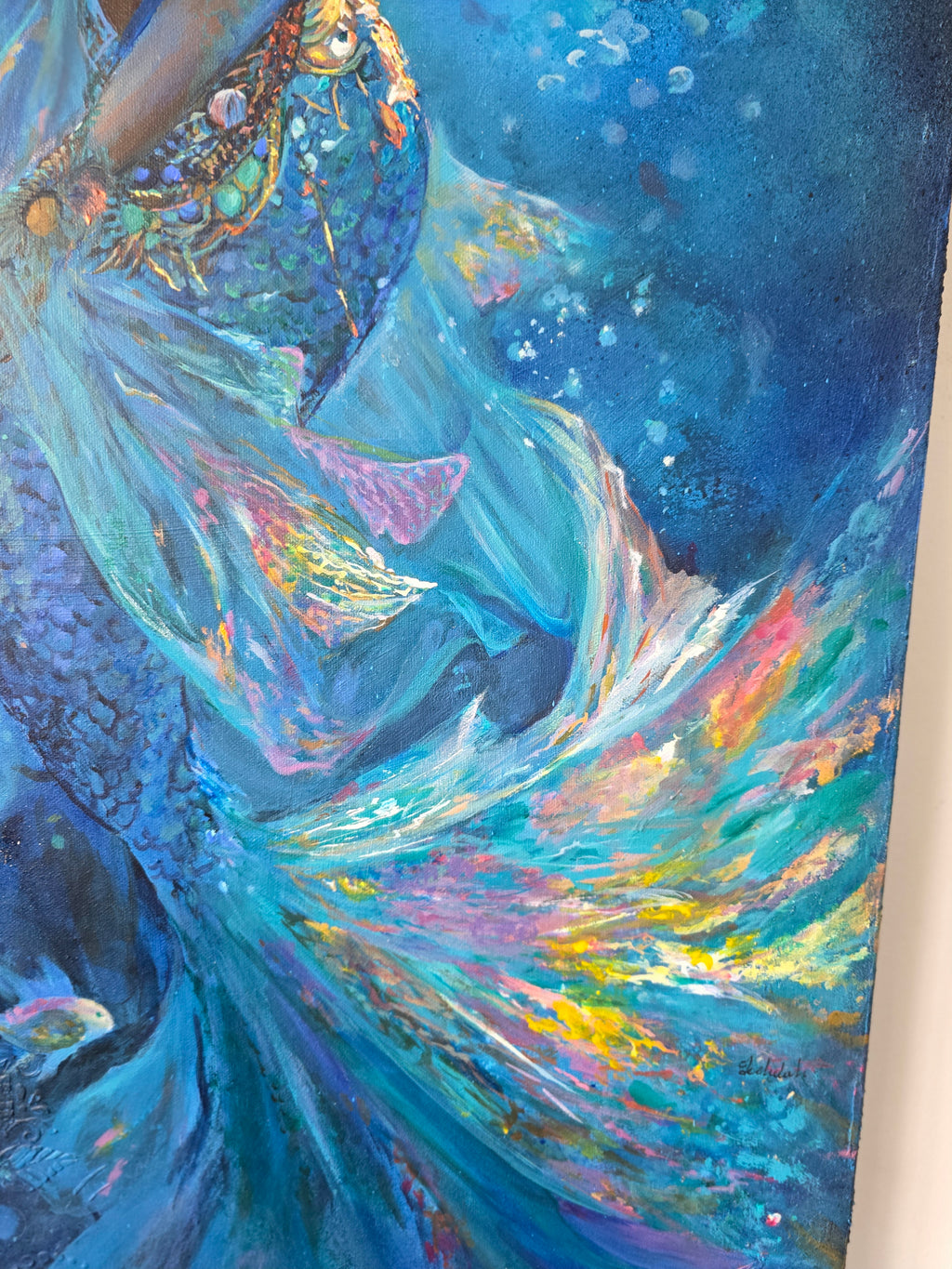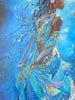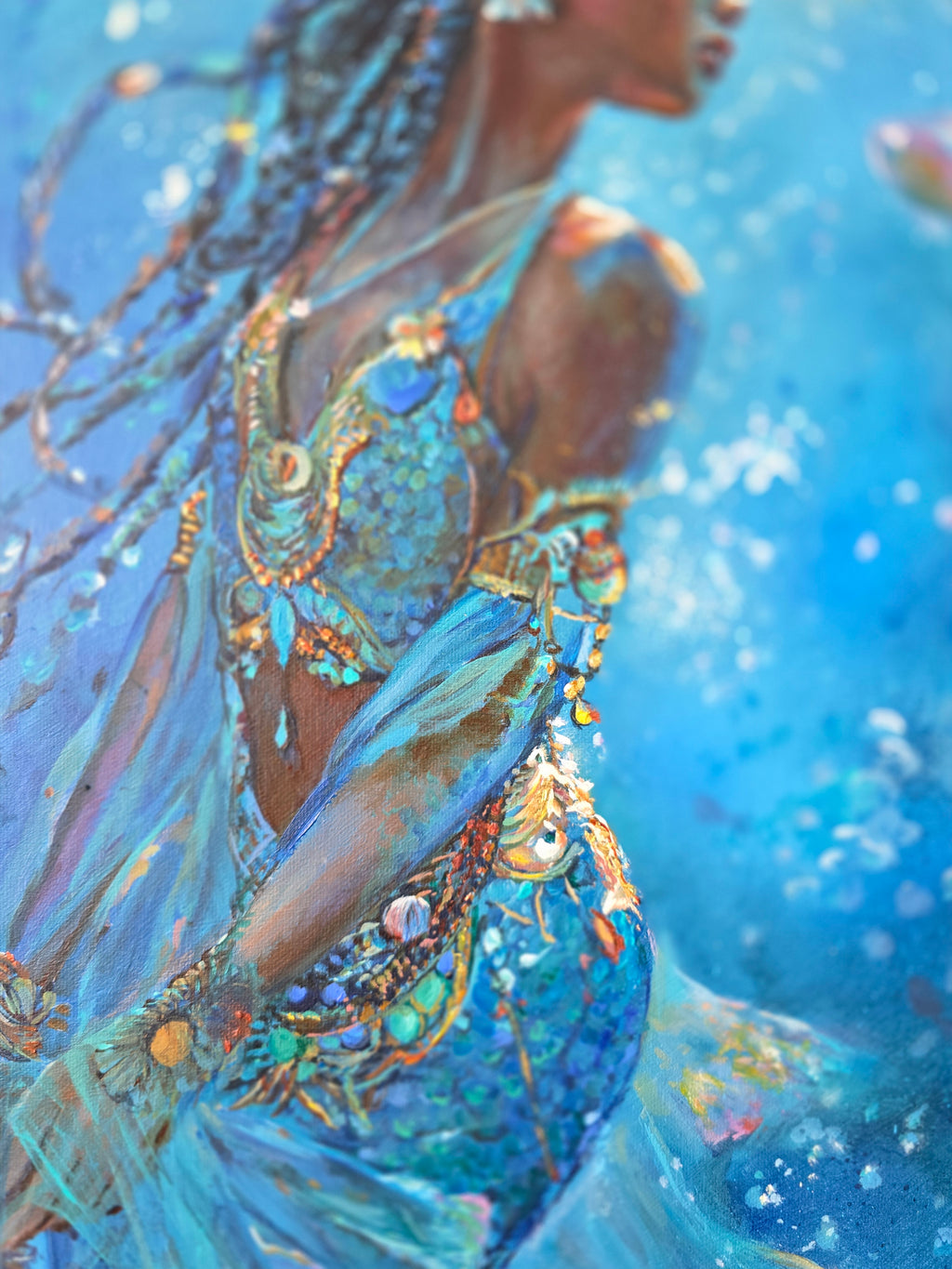 The piece is created as richly layered textured art, incorporating metallic paints, delicate glitter spray, and genuine 24 carat gold leaf. These elements shimmer and catch the light depending on the angle, bringing the surface to life much like the shifting movement of water. Gold leaf highlights her jewellery and embellishments, reinforcing dignity and quiet authority.