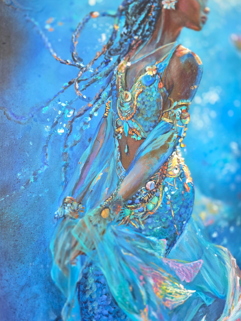 This immersive underwater painting portrays Mwana Tau mid-current, her flowing fabrics and powerful form moving in harmony with the sea. Her profile suggests introspection and resilience — qualities associated with women who upheld their communities through diplomacy, trade, and cultural stewardship along the East African coast.