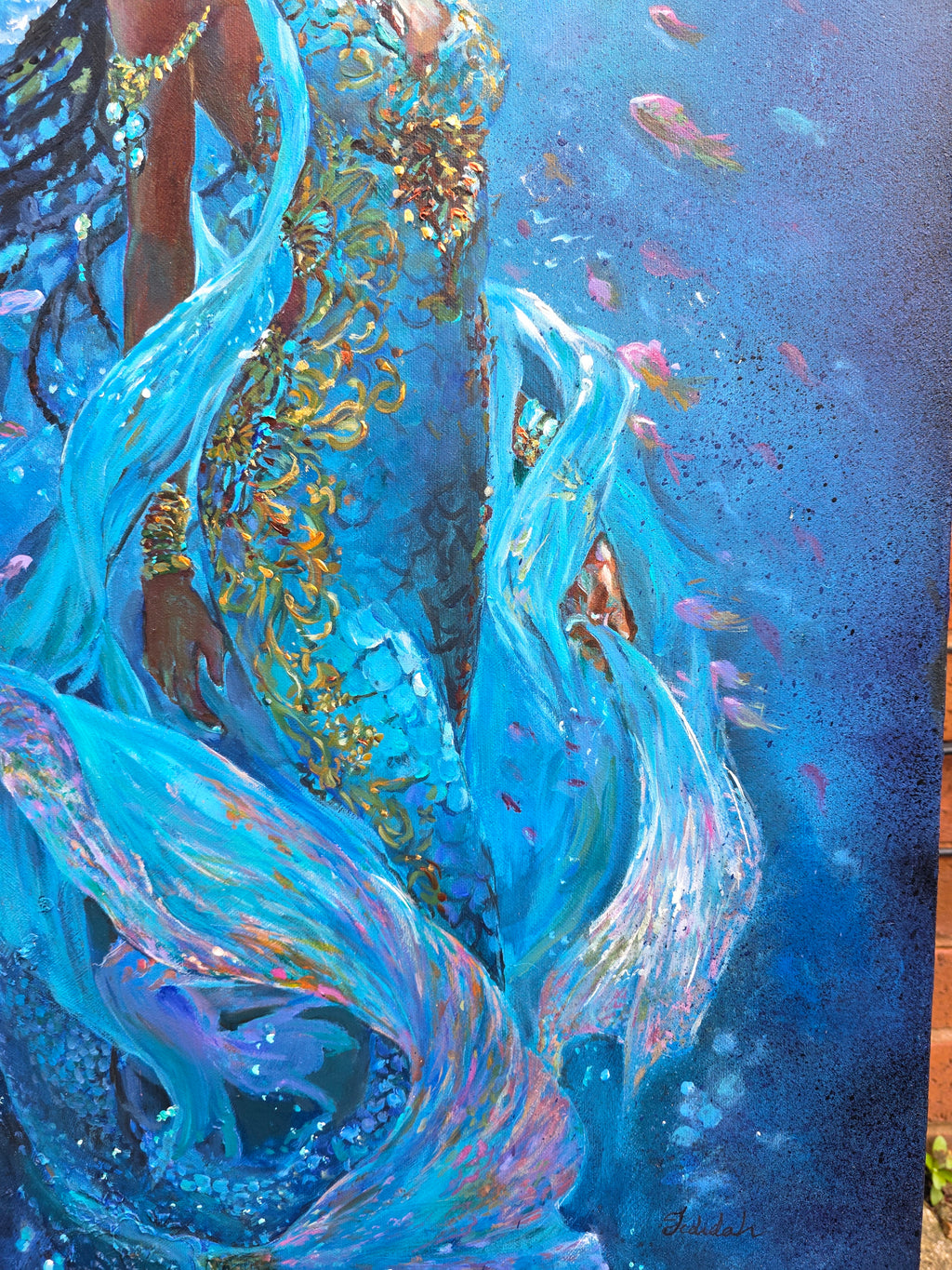 As both African artwork and contemporary mermaid art, this piece bridges historical memory and imaginative interpretation — honouring a coastal ruler whose legacy survives through regional history and cultural reconstruction.