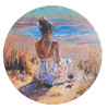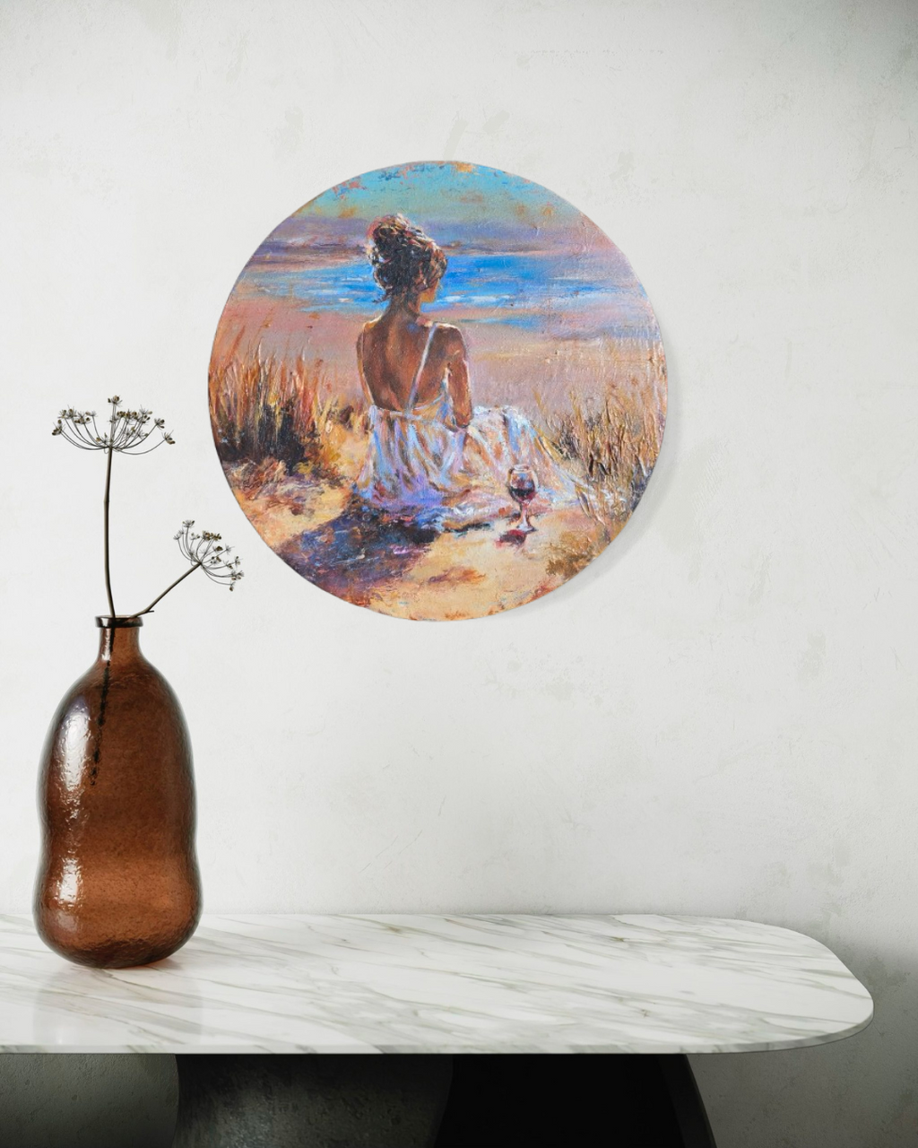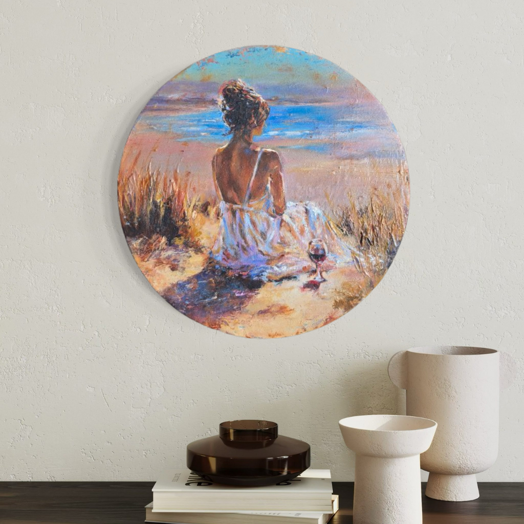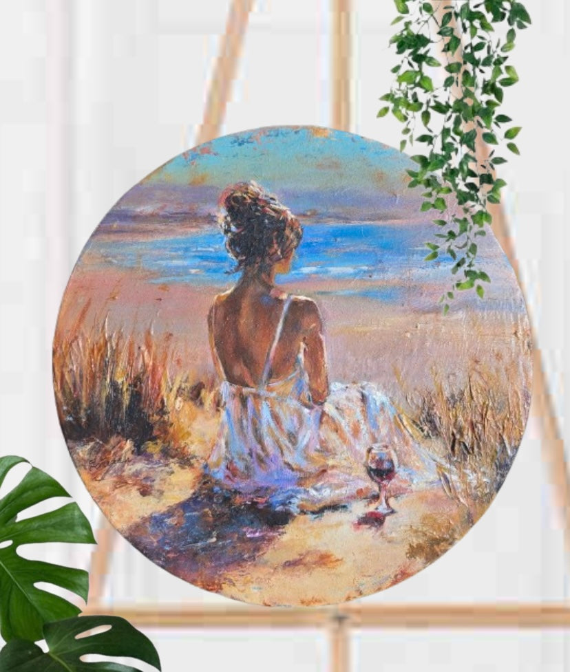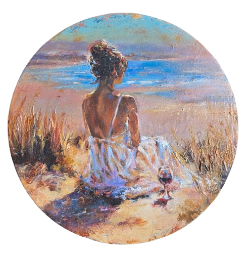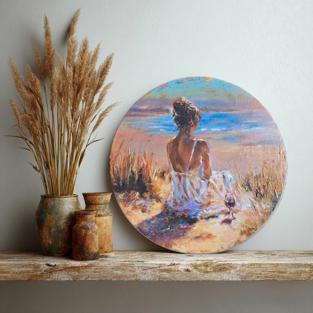 Bathed in golden light, Sunset Solace captures the warmth of dusk along the shoreline. This textured seascape invites you to share in a moment of peace, as the figure gazes out toward the horizon with the glow of sunset reflecting on the water. A glass of wine by her side hints at comfort, presence, and the quiet joy of simply being.