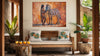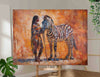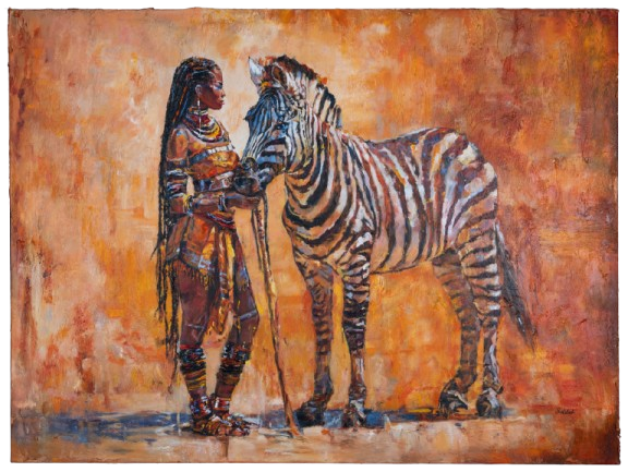 This extraordinary piece of textured art honours Queen Moremi Ajasoro, one of the most celebrated heroines of Yoruba history. Known for her bravery and intelligence, she played a decisive role in protecting Ile-Ife from invading forces. In this striking painting, she is depicted standing gracefully beside a zebra, holding its reins—a symbolic image of wisdom, guidance, and triumph over adversity. The earthy golden tones and layered brushstrokes bring depth and dimension, while her intricate adornments emphasize her enduring legacy.