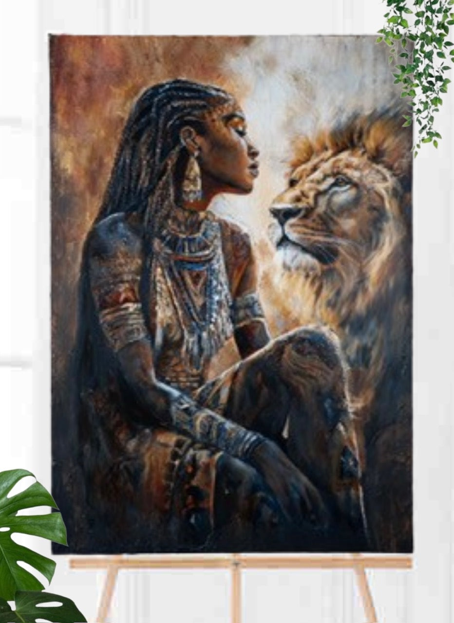 This powerful artwork pays homage to Queen Mmanthatisi, the formidable leader of the Batlokwa during the early 19th century. Known as a warrior queen who led with both strategy and courage, she is portrayed here locked in a gaze with a lion — a symbol of her indomitable strength, fearlessness, and deep connection to the spirit of leadership.