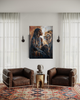 The layered textures and earthy tones capture the intensity of this moment, as the lion becomes both a mirror and a symbol of Mmanthatisi’s authority. The regal adornments and commanding stance reflect her historical role as one of southern Africa’s most respected leaders, remembered for guiding her people with wisdom and resilience during turbulent times.